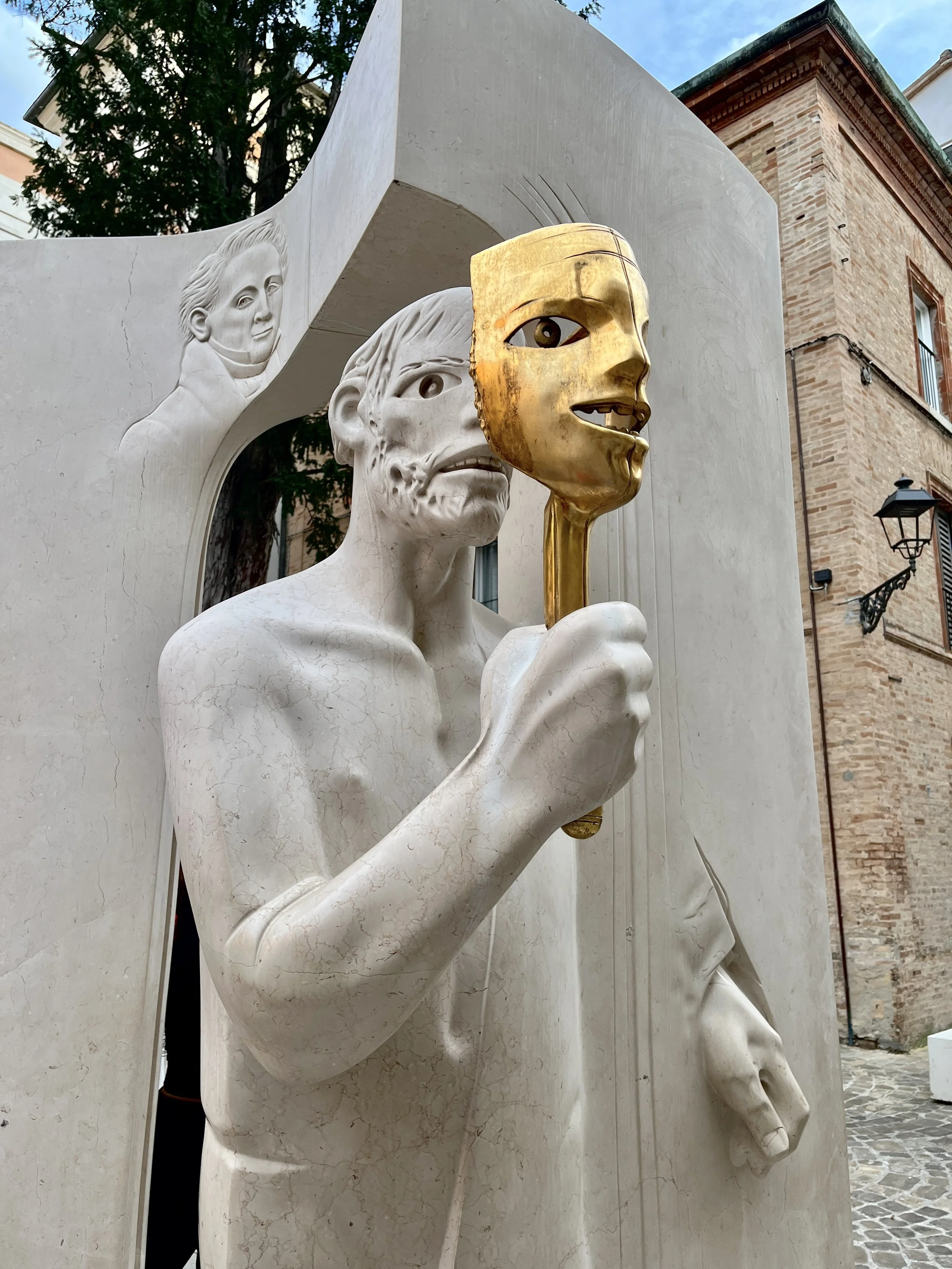 Images: A slice of Pesaro: its architecture; statues of the famous (Garibaldi and Rossini); statue outside the theatre holding a mask; Pesaro’s grand doors and church interiors; its street festivals; Renaissance art; congenial back lanes with alfresco dining; the city’s green space; main plaza; the port; and the beach in summer and at season’s end when everyone has suddenly – from one day to the next – disappeared.