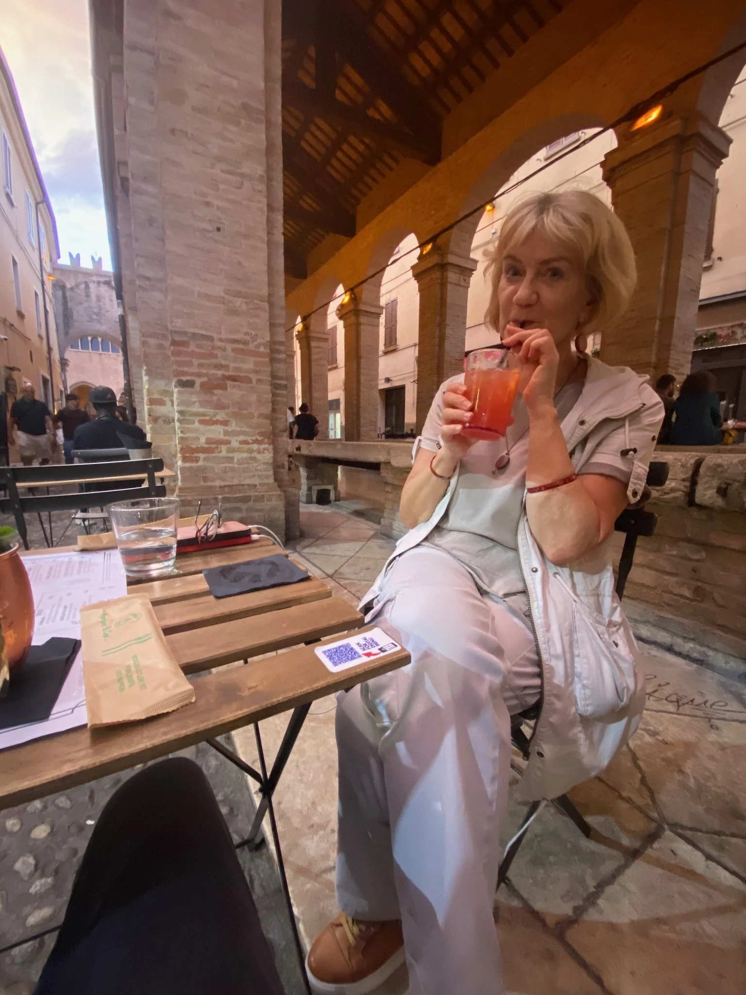 Images: Rimini, with its pretty residences and tree-lined streets; Roman ruins and Tiberius’s Bridge; me downing a Negroni under the columns of a Roman fish market; outdoor dining everywhere; the town plaza overlooked by a Pope; art in the park and Rocco Malatesta/Castel Sismondo housing the Fellini Museum.